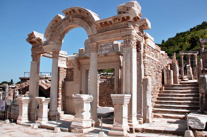 Efes'teki en önemli dini yerlerden biri, MS 2. yüzyılda inşa edilen Hadrian Tapınağı'dır. Tapınak, Roma İmparatoru Hadrian'a adanmıştır ve dört Korinth sütunlu bir cepheye ve tanrıça Artemis'in hayatını tasvir eden bir frize sahiptir.